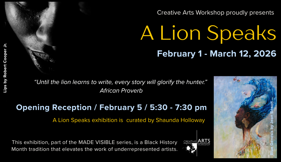 Creative Arts Workshop presents Made Visible 2026: A Lion Speaks, its annual Black History Month exhibition celebrating the work of Black artists and artists of African descent. Now in its eighth year, Made Visible reflects CAW’s ongoing commitment to equity, representation, and amplifying underrepresented voices through the visual arts.